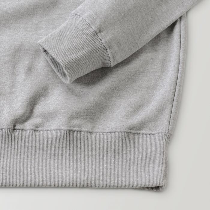 前面にポケットが付かないシンプルなデザインで、しっかりとした生地厚のパーカーです。